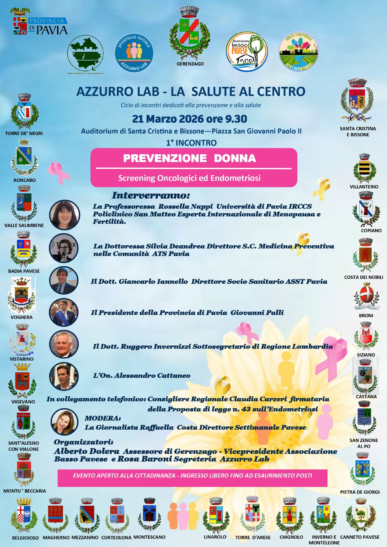 L’iniziativa è promossa dall’Associazione Basso Pavese, in collaborazione con il Comune di Gerenzago, e vedrà la partecipazione di professionisti ed esponenti di importanti realtà sanitarie del territorio, tra cui ATS Pavia, ASST Pavia, Regione Lombardia, Fondazione IRCCS Policlinico San Matteo e CNAO – Centro Nazionale di Adroterapia Oncologica.