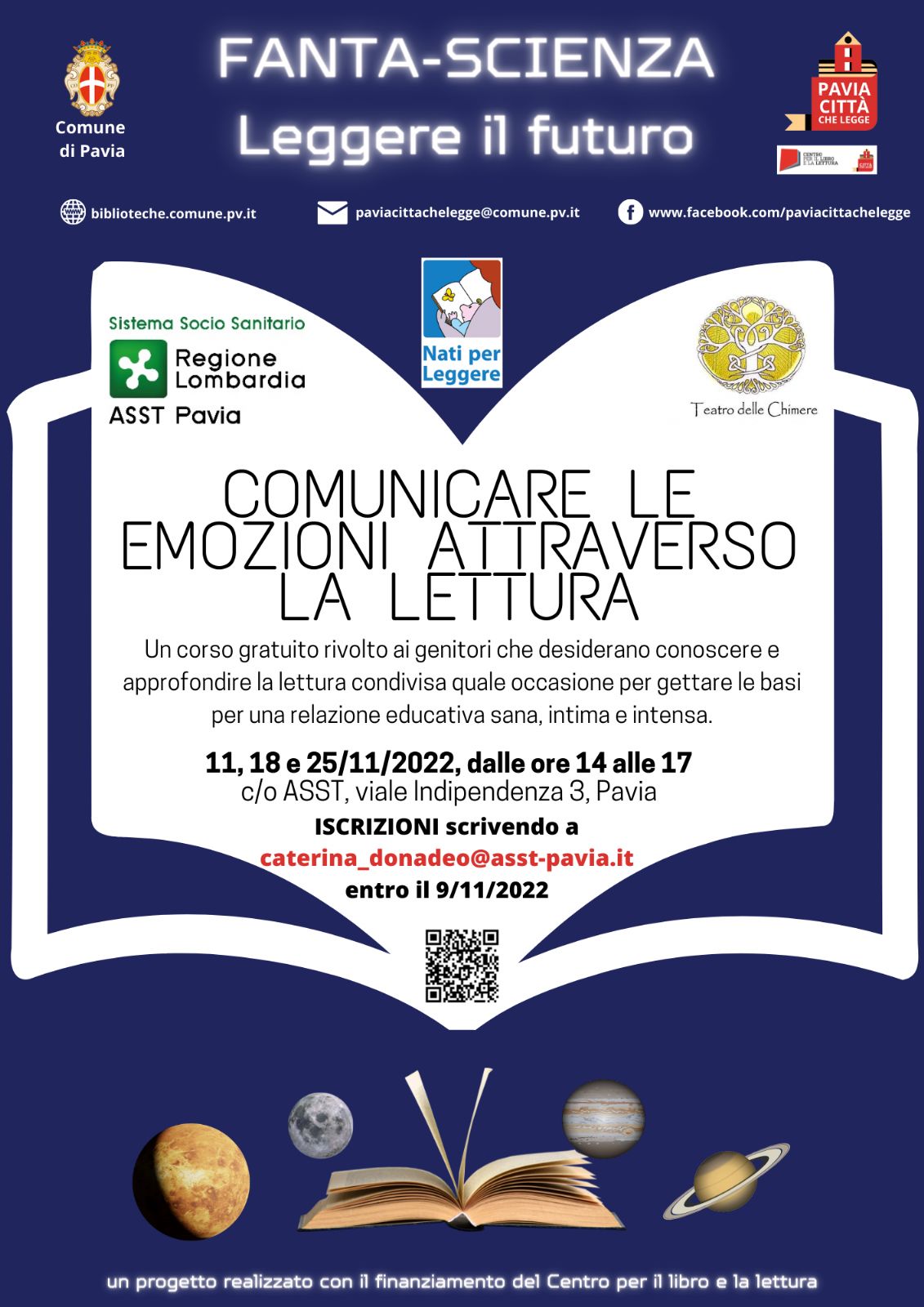 il Comune di Pavia, in collaborazione con il Centro per il Libro e la Lettura di Pavia, Teatro delle Chimere e ASST Pavia, organizza un corso gratuito di lettura condivisa rivolto ai genitori intitolato "Fanta-scienza - Leggere il futuro: Comunicare le emozioni attraverso la lettura".