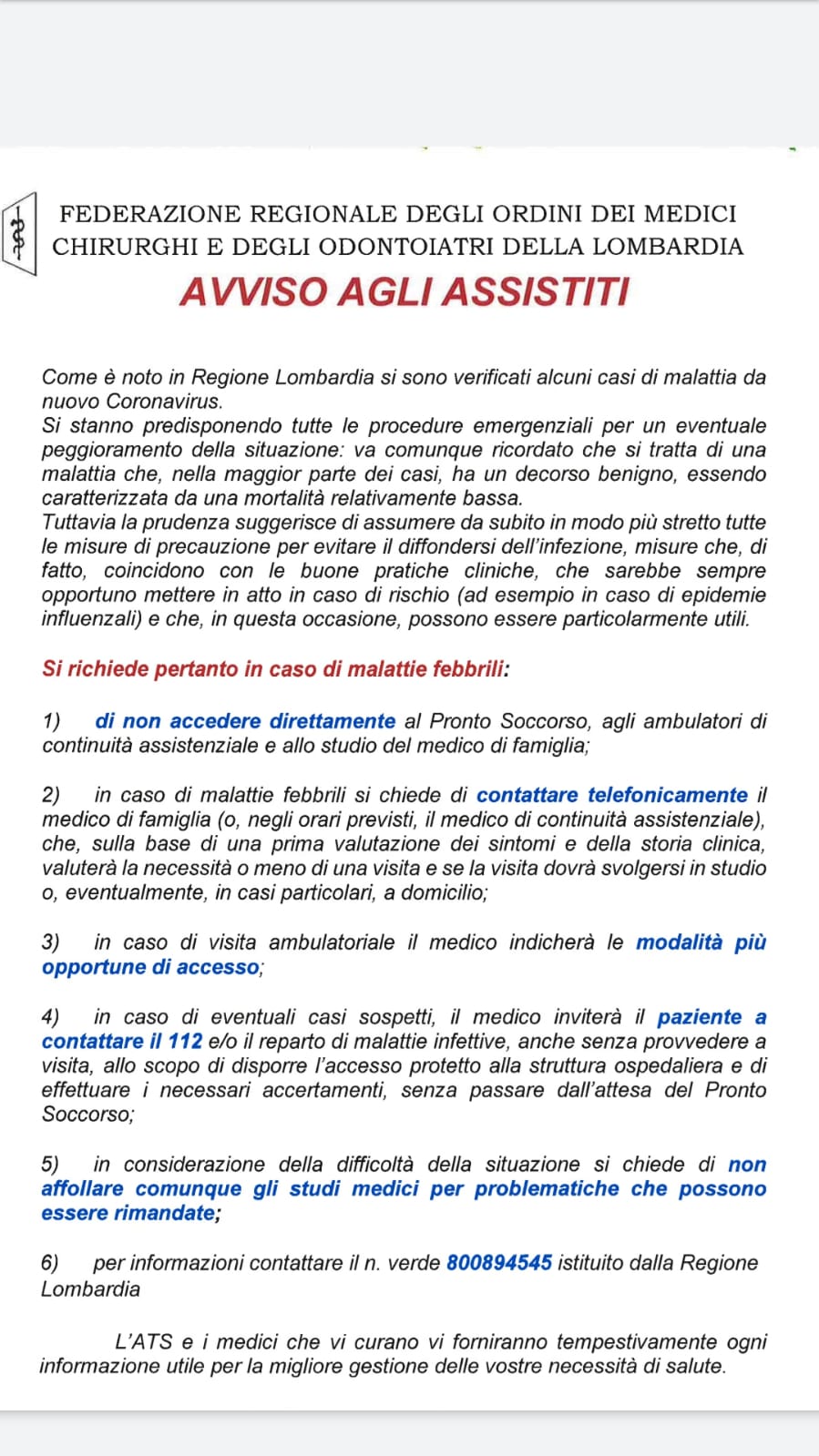 Come già segnalato nella lettera di ieri Domenica 23 Febbraio, chi abbia i sintomi e sia stato nei Comuni della zona Rossa nei 14gg precedenti, devo comunicare la sua situazione al 112. Anche chi sia a conoscenza di essere stato a contatto con un caso di Coronavirus conclamato, deve segnalarlo al 112. Per tutte le informazioni relative al CoronaVirus, Regione Lombardia ha istituito il numero 800894545 oppure al numero istituito dal Ministero 1500. Da giovedì ad oggi sono stati fatti 800 tamponi, 114 sono i pazienti risultati positivi al tampone e solo il 12% è attualmente ricoverato in terapia intensiva. Non bisogna quindi creare allarmismi perché il sistema sta funzionando e non si tratta di una pandemia.