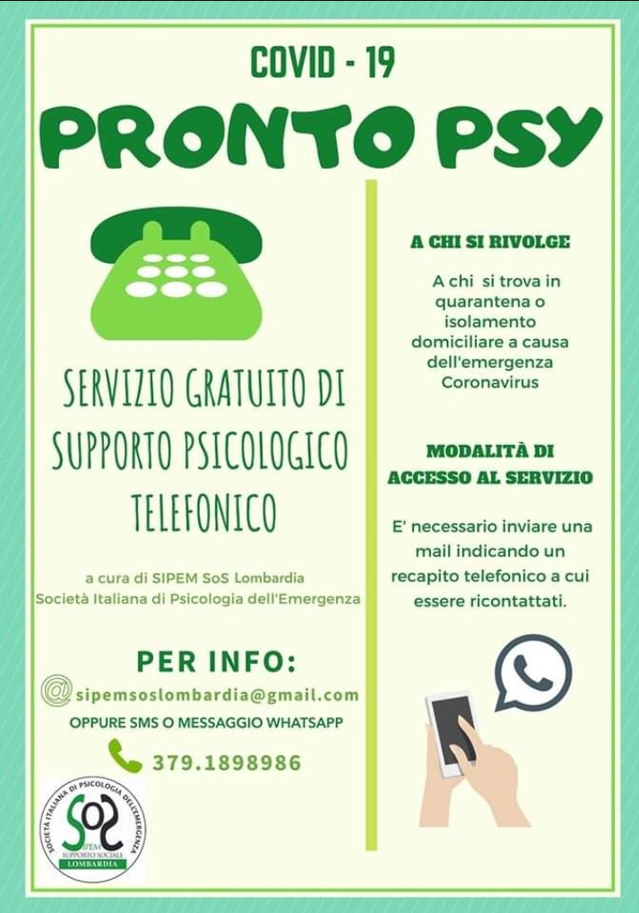 PRONTO PSY - SUPPORTO PSICOLOGICO TELEFONICO – a cura SIPEM SOS – ER, un servizio gratuito per le persone che si trovano in quarantena o in isolamento domiciliare a causa dell’emergenza Coronavirus;