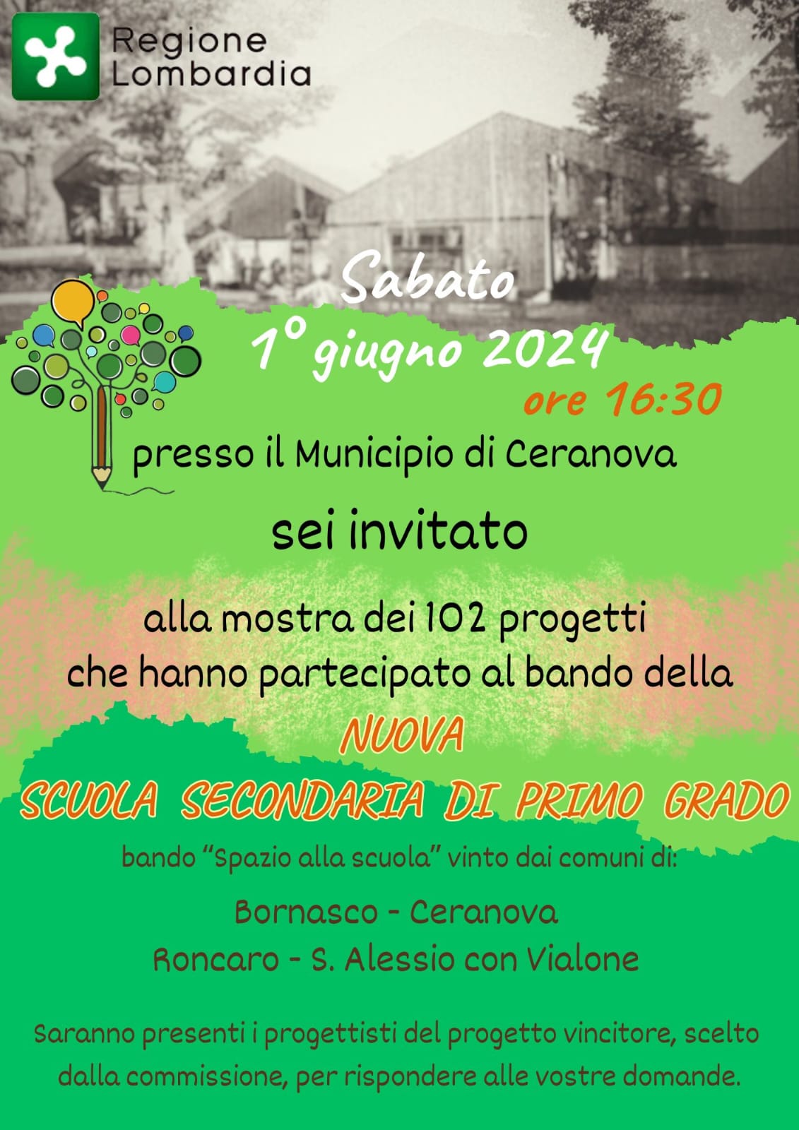 Vi invitiamo a partecipare alla Mostra dei progetti che hanno partecipato al concorso “Spazio alla scuola” per la nuova scuola secondaria di secondo grado dei Comuni di Bornasco, Ceranova, Roncaro e Sant’Alessio con Vialone, che si terrà il prossimo 1° Giugno 2024 alle ore 16:30 presso il Municipio di Ceranova.