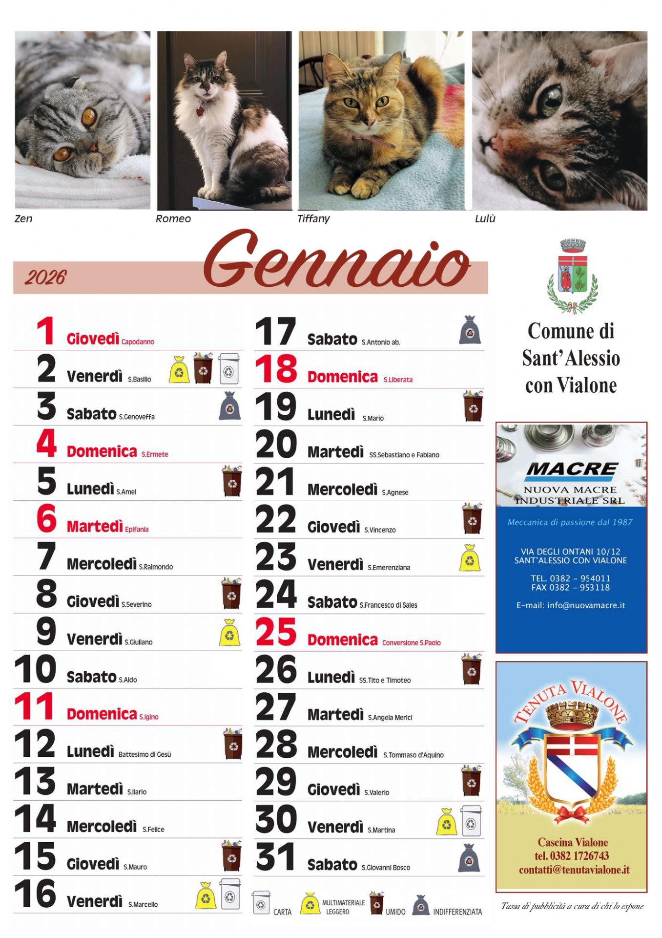 In allegato alla presente comunicazione è disponibile l'immagine del calendario relativo al mese di gennaio, che sarà inoltre stampata e affissa nelle bacheche comunali, così da garantire a tutti un riferimento immediato alle corrette modalità di conferimento.